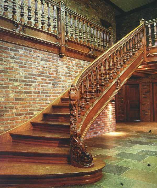 Для уютного деревянного загородного дома в стиле кантри, русской избы или прованс лучше всего подойдет лестница из дерева. Это может быть как лакированное дорогое дерево с ручной резьбой и узорами, так и простая гладко отшлифованная древесина простых пород. Лучше всего для строительства лестницы в доме подходит ясень, орех, тик, клен и бук. Сосна хоть и является самым недорогим материалом, плохо подходит для изготовления лестницы, ее древесина мягкая и подвержена внешнему воздействию.