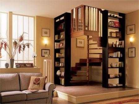 Самым миниатюрным вариантом, пожалуй, является раскладная лестница. Она больше подходит для мансард и чердачных помещений. Для частого использования предпочтительнее винтовые и маршевые модели. Приспособить можно даже одномаршевые конструкции. Довольно оригинально выглядит вход на второй этаж с моделью «гусиный шаг». Экономия места заключается в уменьшении количества ступеней, соотношения между проступью и подступенком, а также увеличении уклона.