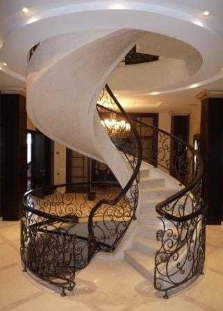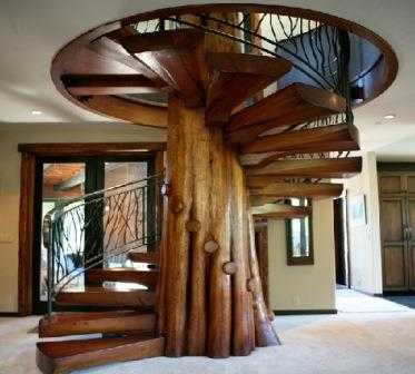винтовая или спиральная лестница обладает особым шармом, она особенно хорошо будет смотреться в домах, выполненных в стиле ампир, рококо, модерн. Винтовая лестница с ажурными перилами навевает ассоциации со сказочным замком. Однако, в реальной жизни такой вариант не слишком удобен. Спиральные лестницы были созданы для маленьких помещений, в которых не было возможности установить широкую конструкцию. В жилом доме она может оказаться небезопасной для маленьких детей и пожилых людей. В центре винтовой лестницы находится опора – деревянная или металлическая труба, к которой крепится узкий край ступени.