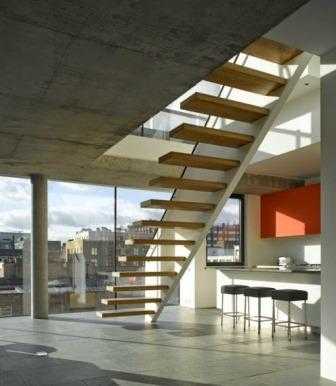 Все чаще в строительстве частных домов используються лестницы на больцах. Ступени крепятся к стене при помощи кронштейнов или штырей, а с другой стороны– связаны между собой – больцами — металлическими штырями. Лестницы выглядят легкими и изящными и экономят площадь в небольшом помещении.