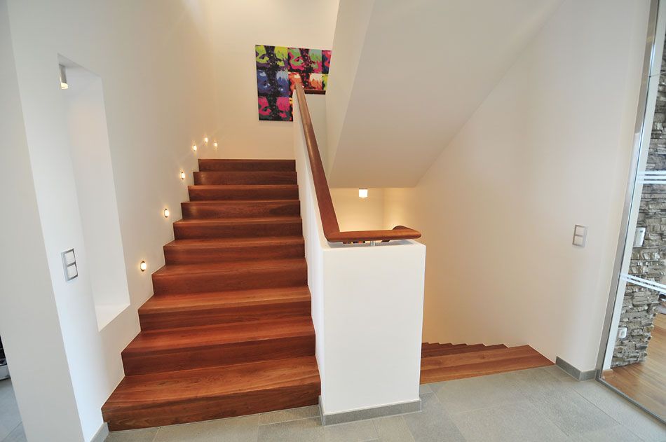 Консольные лестницы из дерева сегодня являются одними из самых популярных в частных домах. У лестниц такого вида нет основания – они крепятся к несущей стене при помощи анкеров, что обеспечивает им безопасность и прочность. В итоге кажется, будто ваши ступени на второй этаж просто парят в воздухе. Дизайн интерьера с такой лестницей смотрится очень оригинально и впечатляюще.