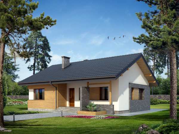 Небольшой одноэтажный домик станет хорошим подспорьем для маленькой семьи с небольшим достатком, так как его возведение обойдется намного дешевле, и оплата за коммунальные услуги будет значительно меньше. Чтобы расширить площадь в таком варианте, можно использовать пространство крыши, на которой организовывают просторные мансардные помещения или площадки для отдыха.