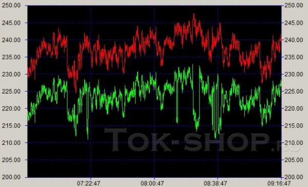 График, на котором представлены замеры напряжения на входе (красное) и выходе(зеленое) электронного стабилизатора в течение определенного времени. Видно, что откорректированное напряжение следует за входным, но остаётся в границах ГОСТа: