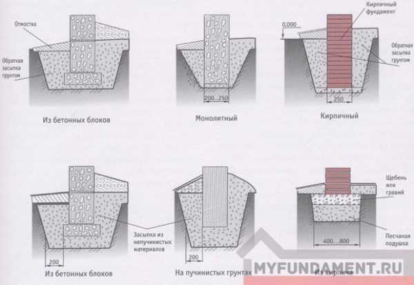 Основы могут быть ленточными, плитными, столбчатыми и свайными.