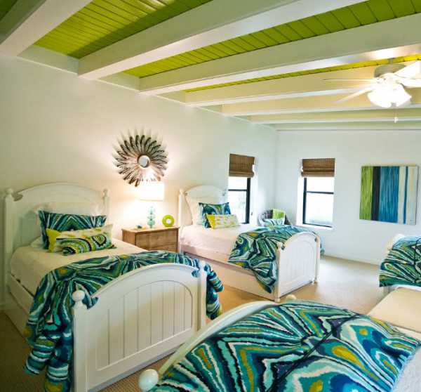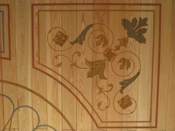 При монтаже вагонки, реек на потолок, выполненный методом балочной подшивки, можно пофантазировать с резьбой, выжиганием и росписью по дереву. Если рейки однообразны, всегда можно найти способ украсить (или покрасить!) какие-то фрагменты, а декорированные узорами балки вообще великолепно выглядят.
