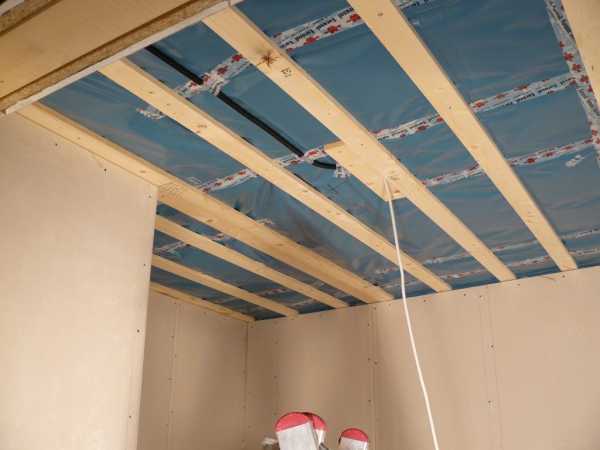 - На поверхность потолка укладывается пароизоляция. При монтаже следует разрезать элементы не в размер, а больше на 5 см от чистового размера. Этот необходимо для того, чтобы внахлёст закрепить материал к балкам перекрытия. Это можно сделать при помощи строительного степлера;