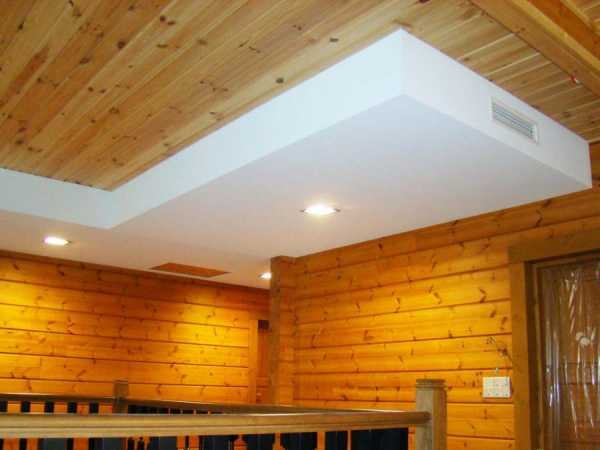 Если дом утеплён изнутри и стены скрыты под отделкой, которая не будет сочетаться с деревом, можно использовать для обшивки потолка пластик, гипсокартон или установить натяжные потолки.