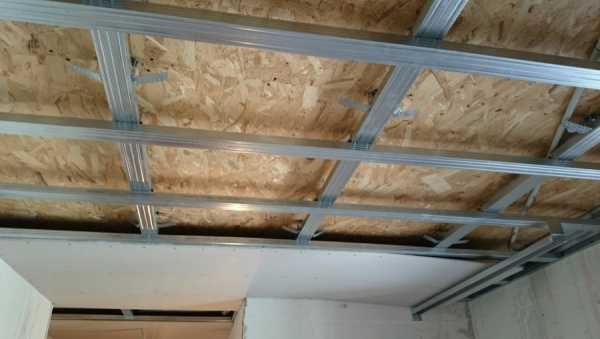 Для монтажа гипсокартона на потолок необходим каркас. Листы крепят к обрешётке саморезами. Каркас может быть деревянным или металлическим, собранным из специального профиля.