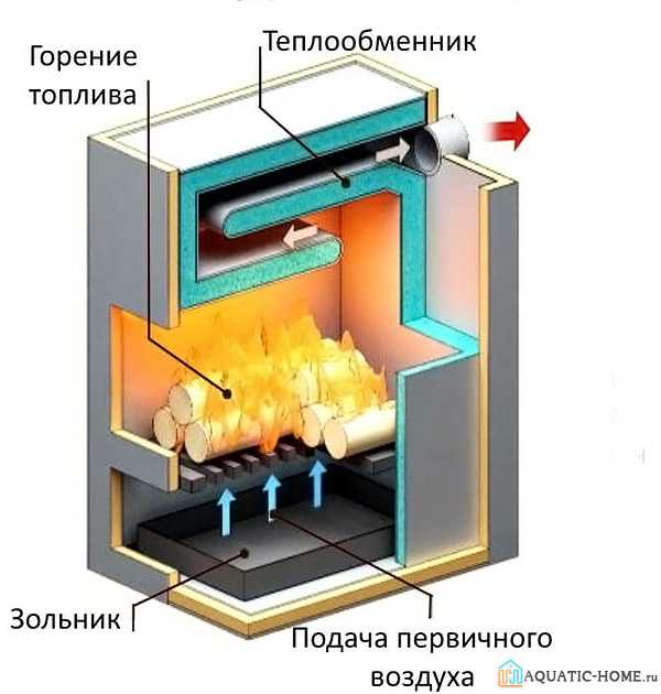 Процесс горения происходит при подаче кислорода снизу вверх. Для этого под колосником существует зольная камера с дверцей – это поддувало, через которое осуществляется забор воздуха. Естественная тяга обеспечивает отвод продуктов сгорания, а в разреженное пространство снизу затягивается атмосферный воздух. При таком типе горения дрова быстро просыхают и активно горят. Одна закладка прогорает за 3-4 часа. В обычном режиме можно сжигать все, что угодно: дрова, обрезки, куски ДСП, опилки, мусор. Основной недостаток – огромное количество тепла «вылетает в трубу».