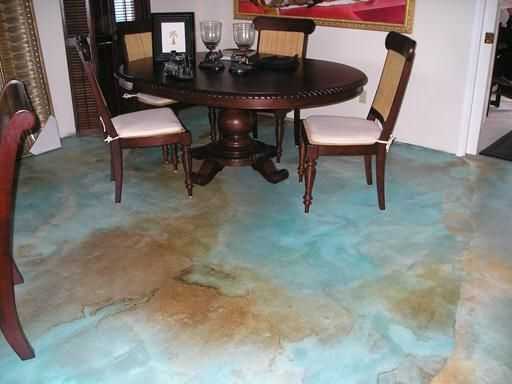 Если шлифмашинки нет, бетон можно покрасить. Чтобы придать полу глянец, лучше всего использовать полиуретановую эмаль – двухкомпонентный состав наносится в два слоя и после высыхания образует гладкую и блестящую поверхность. Интересного эффекта можно добиться, если наносить краску нескольких оттенков неравномерными пятнами.