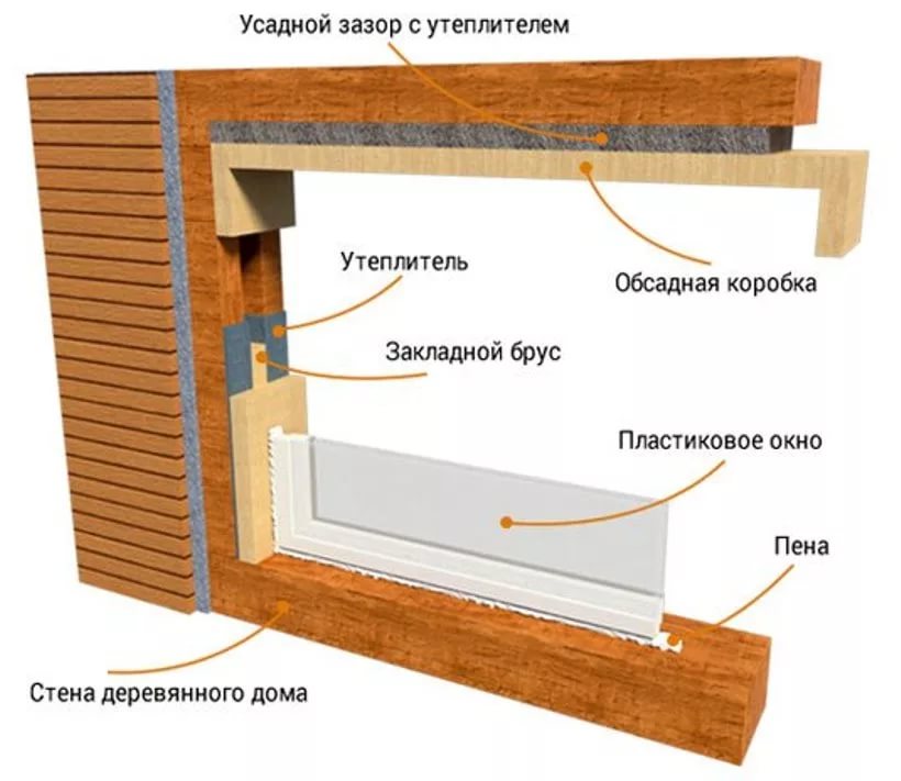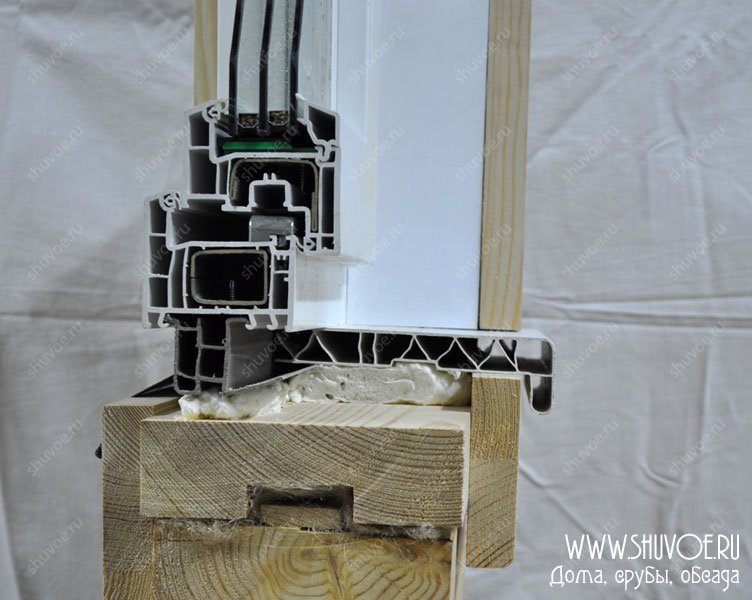 Правильная установка пластикового окна в деревянном доме — окно вставлено в короб из бруса, который скользит в проеме и не мешает усадке дома.