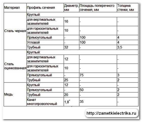 Вот таблица (ПУЭ, табл.1.7.4) рекомендуемых размеров вертикальных и горизонтальных заземлителей (электродов) и заземляющих проводников для прокладки в земле: