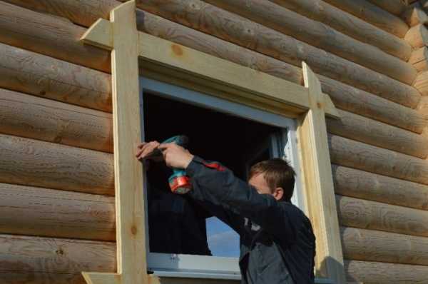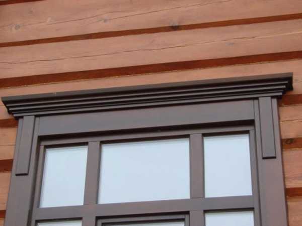 Чтобы вода, стекая по стене, не попадала под наличник, необходимо установить сверху козырек. Для этого в бревне или брусе нужно сделать пропил и утопить туда край планки козырька, затем загерметизировать.