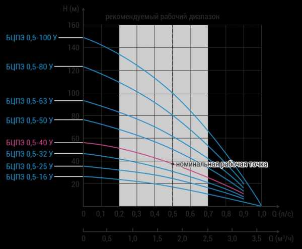 Смотрим на гидравлическую характеристику насосов компании «Промэлектро» и выбираем насос Водолей БЦПЭ 0,5-40 У, который при расходе в 1,65 м³/ч обеспечивает 42 метра напора. Разница в напоре в 0,4 метра (42,4м — 42м) не играет в данном случае никакой роли, так как мы все значения по расходу и напору брали с запасом и погрешность расчетов сопоставима с этим значением. Рабочая точка находится близко к номинальному режиму работы, что очень хорошо (1,8 м³/ч — режим максимального КПД для всех насосов Водолей БЦПЭ 0,5). При этом насос имеет максимальный напор (при нулевом расходе) на уровне 60 метров, что гарантирует обеспечение расчетного давления выключения насоса, установленного нами на уровне 3,5 бар (35 м + 6,9 м +5,5 м = 47,4 м