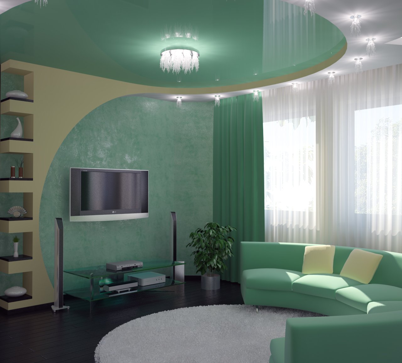 Дизайн натяжного потолка в гостиной: виды, материалы, фактура