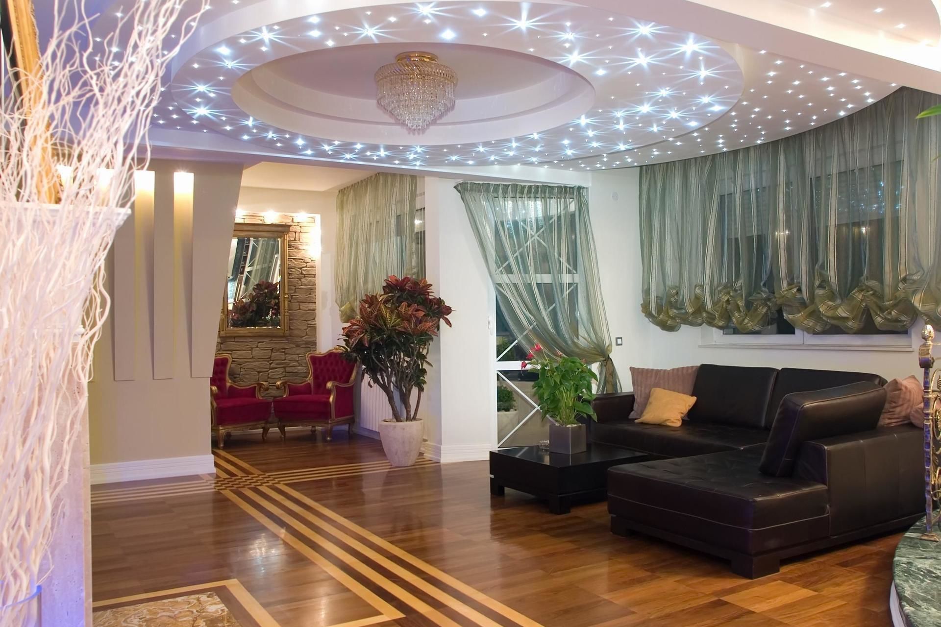 Сложные потолки вписываются не во все интерьеры. При желании и возможности можно соорудить в маленькой комнате двухуровневый потолок, но смотреться это будет очень нелепо. Но для просторного зала такое интерьерное решение будет просто находкой. При сооружении двухуровневых потолков следует учитывать, что фактическая высота помещения потеряет около 6-10 см.