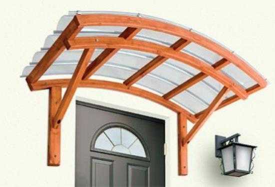 Маловесные козырьки над крыльцом могут быть маленькими и закрепляться на стене дома снаружи. Независимые навесы из дерева, могут сооружаться вдалеке от дома, например, на верандах и террасах.