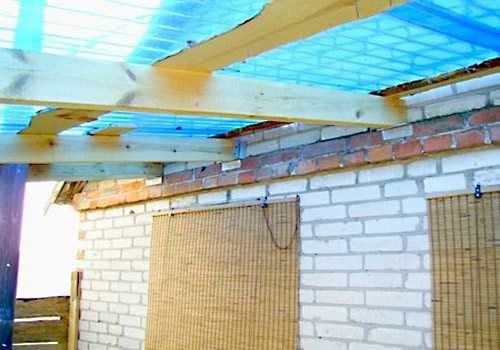 - Установка стропильной системы. В качестве стропил используйте брусья, сечением 150×50 мм. Они обеспечат достаточную прочность, чтобы выдержать перекрытие пролета в 6 м. Расстояние между ними – 1 м. При этом, один конец стропил фиксируется к стене, а другой устанавливается на верхнюю обвязку. Чтобы соединить всю конструкцию можно использовать стальные уголки, гвозди или саморезы по дереву. Что касается крепления к стене, то его лучше делать посредством металлических анкеров или дюбелей.