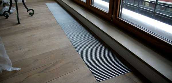 - Конвектор, встраиваемый в пол, – удобное предложение для тех, кто не любит портить дизайн интерьера посторонними предметами, а также для обеспеченных слоёв населения. После монтажа устройство закрывается специальной решёткой и никак не выделяется среди предметов. Этот вариант довольно затратен, а также актуален только при капитальном ремонте полов в помещении.