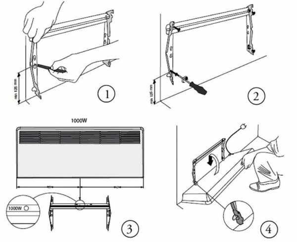Выбрав место, нужно наметить четыре точки, соблюдая следующие требования: отступаем не менее восьми сантиметров от пола, двенадцать сантиметров − от подоконника и пять сантиметров − от самой стены. Обозначив отметки, берём дрель или перфоратор и делаем отверстия в стене. Достаём поставляемый в комплекте кронштейн и закрепляем его при помощи крепежа. Аккуратно устанавливаем прибор на кронштейн, подключаем к розетке и приступаем к эксплуатации.