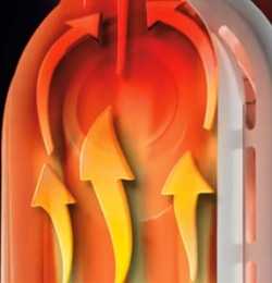 Предельная температура, до которой могут нагреваться радиаторы, – 150 градусов, но обычно она значительно ниже. После включения сначала греется тэн, передает тепловую энергию теплоносителю, который в свою очередь прогревает корпус прибора. Воздух, соприкасаясь с горячими поверхностями, нагревается и поднимается вверх. Таким образом, отопление осуществляется конвективным способом.