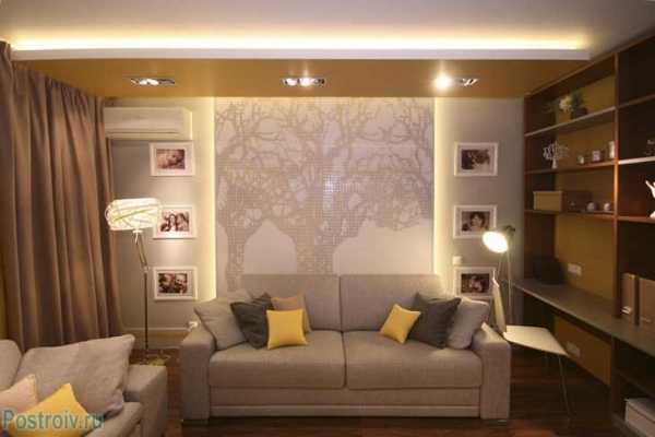 Дизайн интерьера зала 18 кв. м предполагал возведение небольшой ниши из гипсокартона с точечными светильниками шириной 15-20 сантиметров.