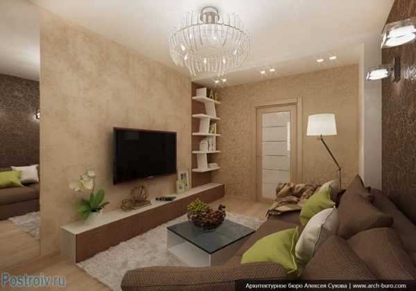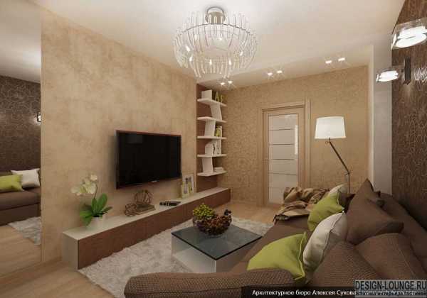 Следующий дизайн отличается яркими вставками шоколадного цвета. Главное правило в дизайне зала 16-18 кв. м, это много света. Помимо основного источника света обязательно должно использоваться дополнительное освещение, как в нашем случае.