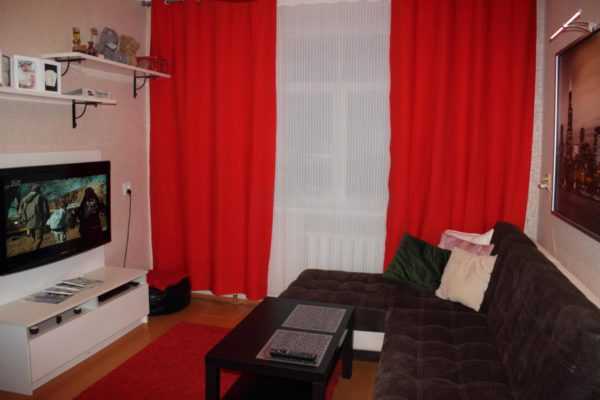 Яркие красные занавески и коврик на фоне темного дивана и журнального столика