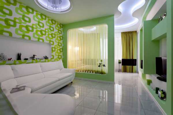 Светлый глянцевый натяжной потолок визуально делает зал больше. А дополнительно точечное освещение только подчеркивает это.