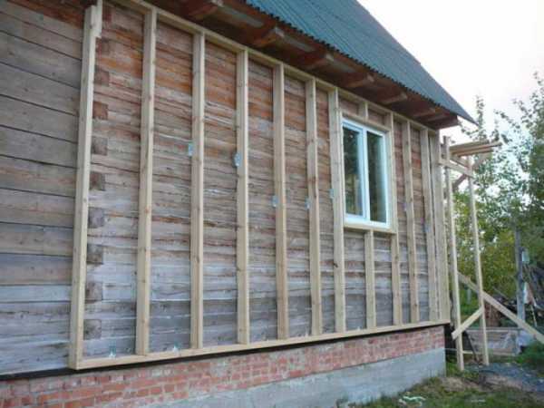 Затем идет очередь каркаса. Брусок, сечением 50х50 набивается по вертикали, по всей стене дома. Шаг между каждой планкой 40—50 см. Крепление гвоздями, но лучше специальными шурупами по дереву. Они прочнее фиксируют материал, не позволяя ему отойти от основы в процессе эксплуатации. Гвозди, не имея резьбового соединения, от климатических перепадов, могут повылезать со временем из дерева.