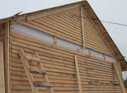 Если дом выстроен из круглых брёвен, нужно сделать реечный каркас. Толщина реек 20–30 мм. Их нужно вертикально прибить к стене на расстоянии 400–500 мм друг от друга. И уже на них монтировать полиэтилен.