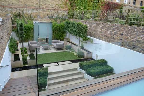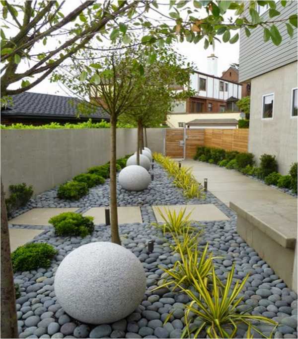 - если ваш дворик все же будет оформлен в строгом стиле, тогда используйте повторяющиеся элементы(кусты самшита, вазоны, декоративные камни, фонари)