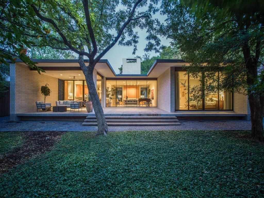 Дом в стиле Райта может быть построен в форме буквы Г. Это одноэтажный дом с горизонтальной ориентацией, который внешне кажется приземистым. Фасад одноэтажного дома визуально делится на несколько частей. Это дом с открытой объемной планировкой, лаконичный, без разнообразных вычурных элементов и деталей.