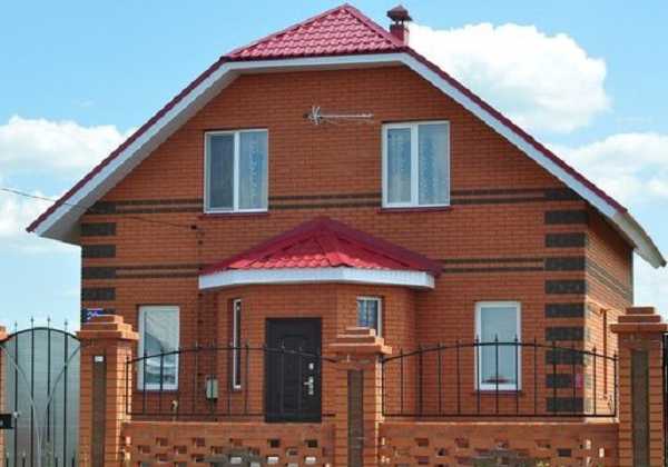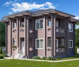 Кирпичный коттедж на две семьи привлекает взгляд своей самобытностью: терракотово-красными фасадами, вальмовой крышей из металлочерепицы черного тона и белым архитектурным декором.