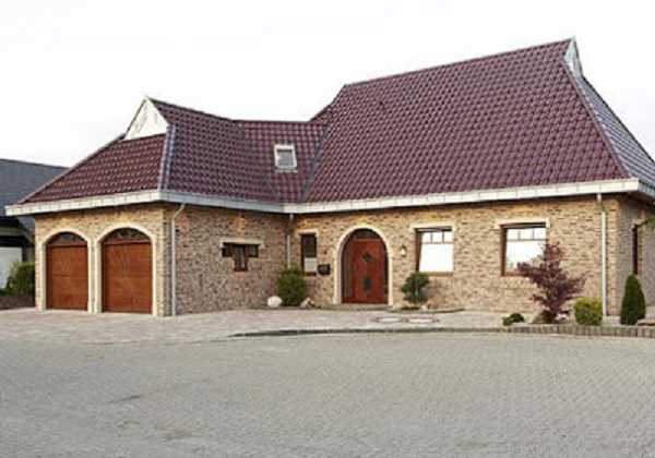 В одноэтажных домах вальмовая кровля может быть составлена из нескольких скатов, переходящих друг в друга ступенькой. Это позволяет отказаться от старой и неинтересной длинной и вытянутой конструкции дома в пользу нескольких построек, как бы примыкающих друг к другу и образующих одно законченное здание.