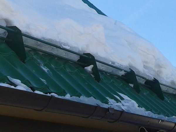 Обязательный элемент при обустройстве кровли из металлочерепицы — это снегозадержатели, препятствующие лавинному сходу снежного покрова с крыши.