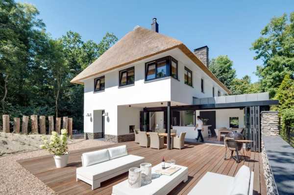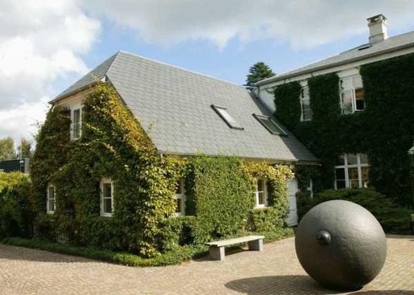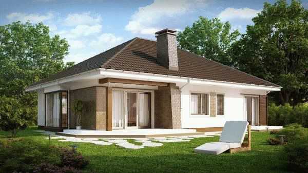 В современной архитектуре датская конструкция кровли одноэтажного дома позволяет располагать деревья очень близко к стенам дома. Крона деревьев хорошо уживается с острыми скатами у конька и пологими у нижней части кровли одноэтажного дома.
