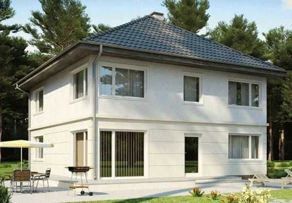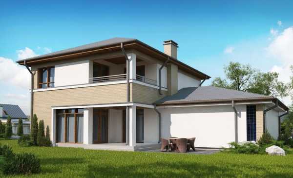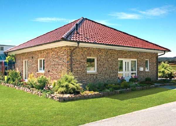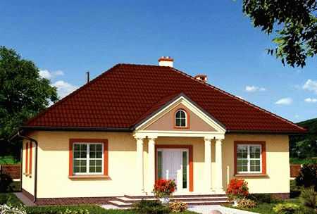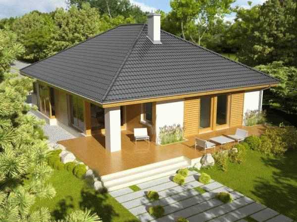 Замечено, что в регионах с большим количеством осадков одноэтажный дом с вальмовой крышей – лучший из возможных вариантов возведения малоэтажных зданий. Площадь кровли у четырехскатной крыши больше, чем у двускатной кровли. Особенность конструкции каркаса такова, что она позволяет отвесы карниза спускать за пределы несущих стен. Таким способом часто при строительстве формируется козырек, который надежно защищает фасадную отделку от воздействия атмосферных осадков.