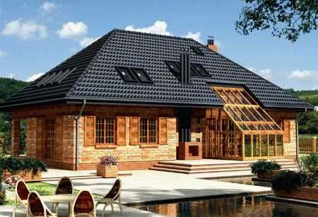 Вальмовая или шатровая форма имеет куда более серьезные возможности, особенно для одноэтажного дома. Невозможно построить низкую и очень покатую крышу, у которой значительную часть кровли, вообще, используют в качестве навеса над огромной террасой. Такие проекты дома характерны для теплых равнинных зон, где мощные порывы ветра сочетаются с избытком солнечного света и тепла.