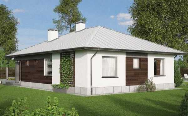 Вальмовую конструкцию крыши применяют как в чистом виде, так и в сочетании с обычными двухскатными крышами. Общее впечатление от одноэтажного дома только усиливается. Хозяева выбирают такие архитектурные решения, в первую очередь, из-за большого чердачного помещения, в двухскатном варианте, вторая часть – вальмовая смягчает общий дизайн и делает всю композицию одноэтажного дома более современной и утонченной.