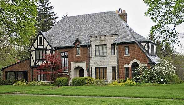 Вальмовая крыша этого кирпичного коттеджа эффектно скомбинирована с шатровой кровлей над гаражом и конусной — над эркером.