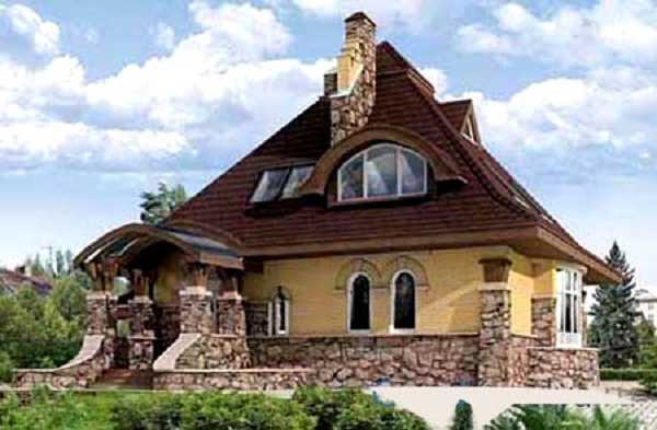 Шатровая схема не ограничивается только низкими скатами кровли. Очень живописно выглядят разнообразные «теремки», стилизованные под сказочные или фантастические варианты дома.