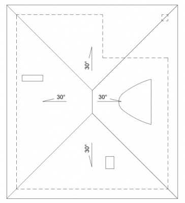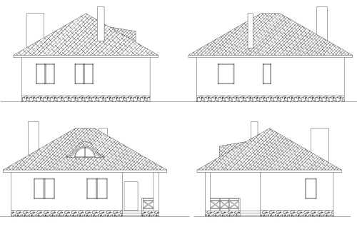 Как мы уже отметили, дом – одноэтажный с четырехскатной вальмовой кровлей уклоном в 17°. Вход в дом располагается с северной стороны. На основном этаже будут находится такие помещения, как: гостиная, кухня, спальня, санузел, ванная, парилка, кабинет и котельная.