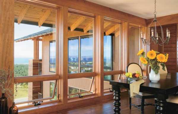 - Деревянные окна выполнены из природного, эстетичного и экологически чистого материала, который отличается прекрасными теплоизоляционными качествами. Минус древесины заключается в ее горючести, но эту проблему можно частично решить, обработав материал специальными составами. В угловом остеклении отдельные окна стыкуются между собой с помощью герметика и не требуют дополнительного использования угловых импостов. Такое соединение позволяет создавать конструкции высотой около 3 м.