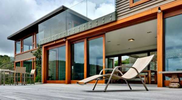 Безопасные металлические ограждения для панорамных конструкцийПрекрасно смотрятся дома из профилированного бруса с панорамными окнами из древесины. Подобный материал популярен, благодаря своей экологичности и энергоемкости. Твердые породы древесины обрабатываются специальными химическими растворами, которые защищают от грибка.