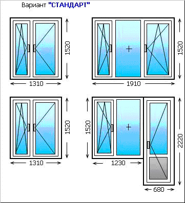 Стандартные размеры пластиковых окон в панельном доме в комнатах 208×142 см, на кухне — 147×142 см, на лоджии — 87×142 см. Дверной проем на лоджии имеет габариты 70×218см.