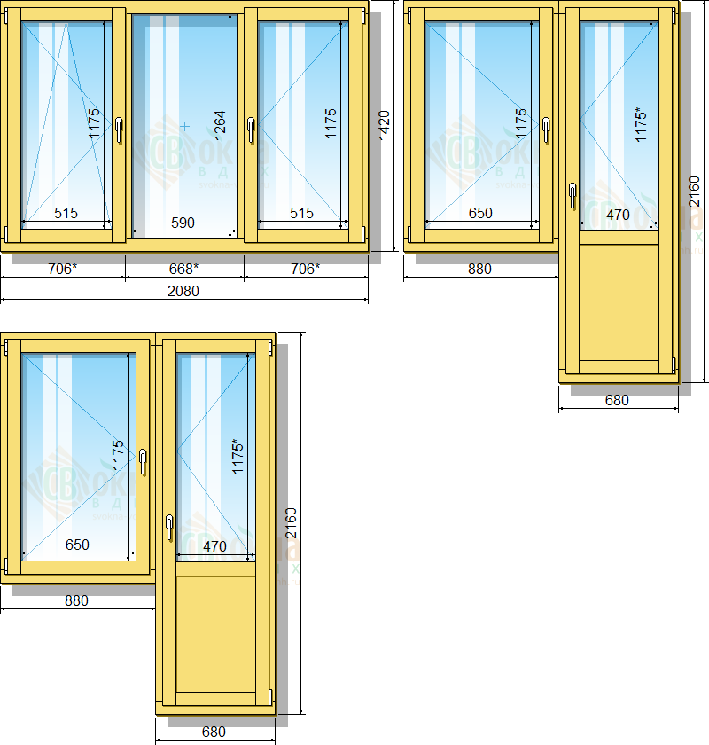- окна балкона — 1520×2150 мм/2080×2250 мм.