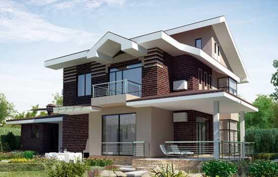 Красивый дом из красного кирпича с окнами нестандартной формы.