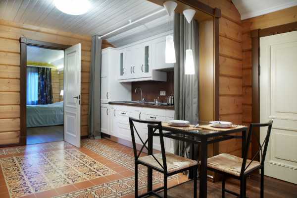 Интерьер дома из клееного бруса хорошо смотрится как в светлом, так и темном исполнении. Для кухни идеально подойдет французский «Прованс». Стены оформляют белой матовой пропиткой, главным элементом «Прованса». Напольное покрытие кухни лучше всего делать из влагостойкого материала. Дерево здесь быстро износится и потеряет товарный вид. Поэтому лучше использовать керамическую плитку. Бытовую технику лучше закрывать деревянными фасадами. Металл и пластик здесь будут неуместны.