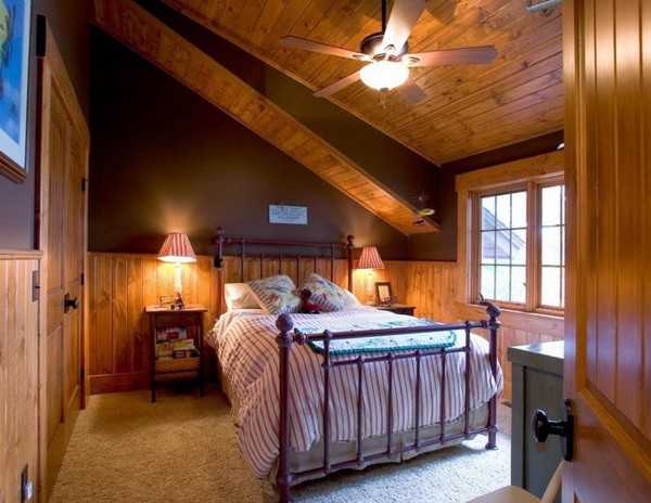 Мансардная спальня в темных тонах выглядит очень уютно. Такая отделка сохранит экологичность помещения и не потребует серьезных вложений.